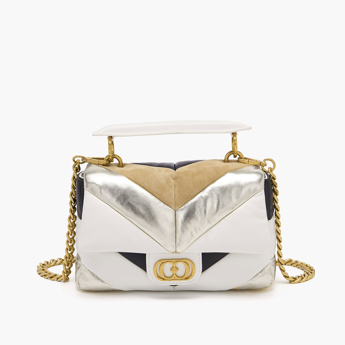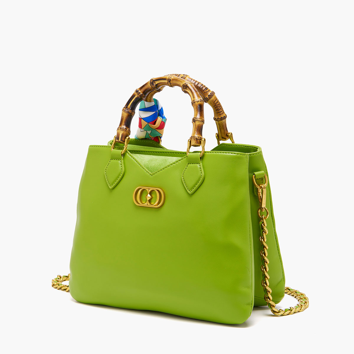 borsa a mano in pelle con dettagli in pelle scamosciata e manici in bamboo.