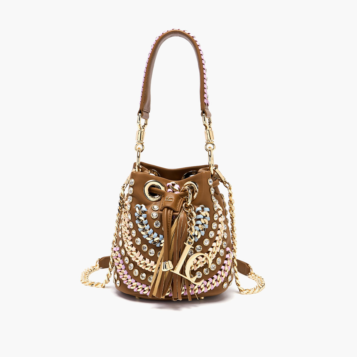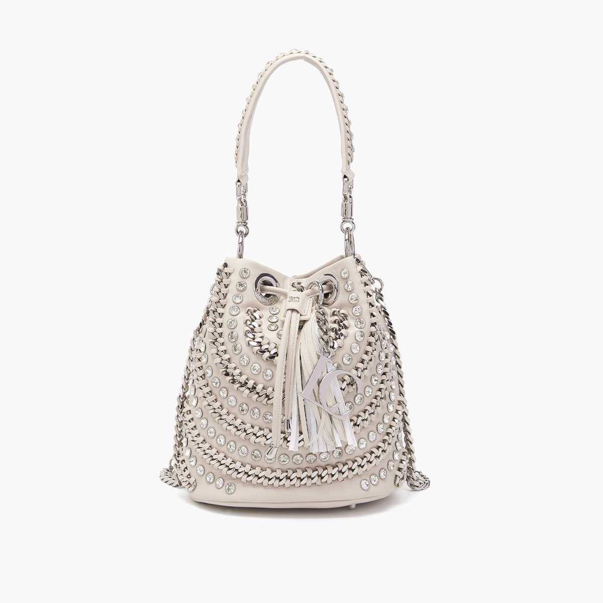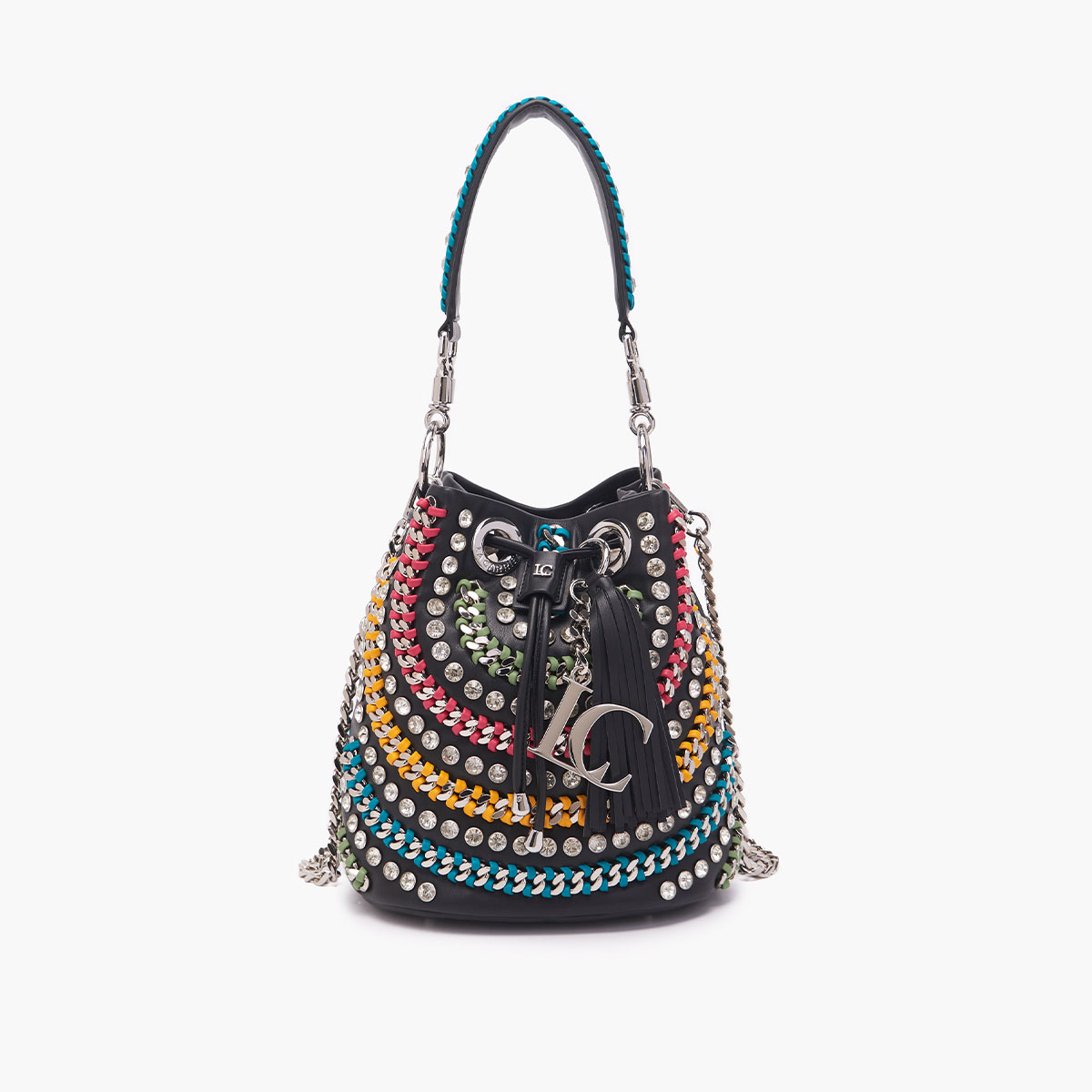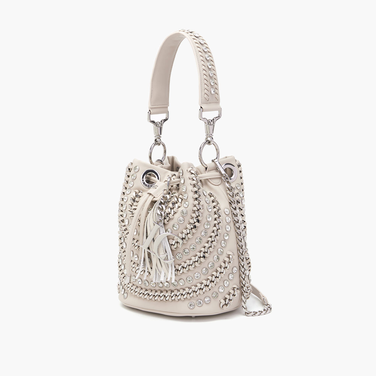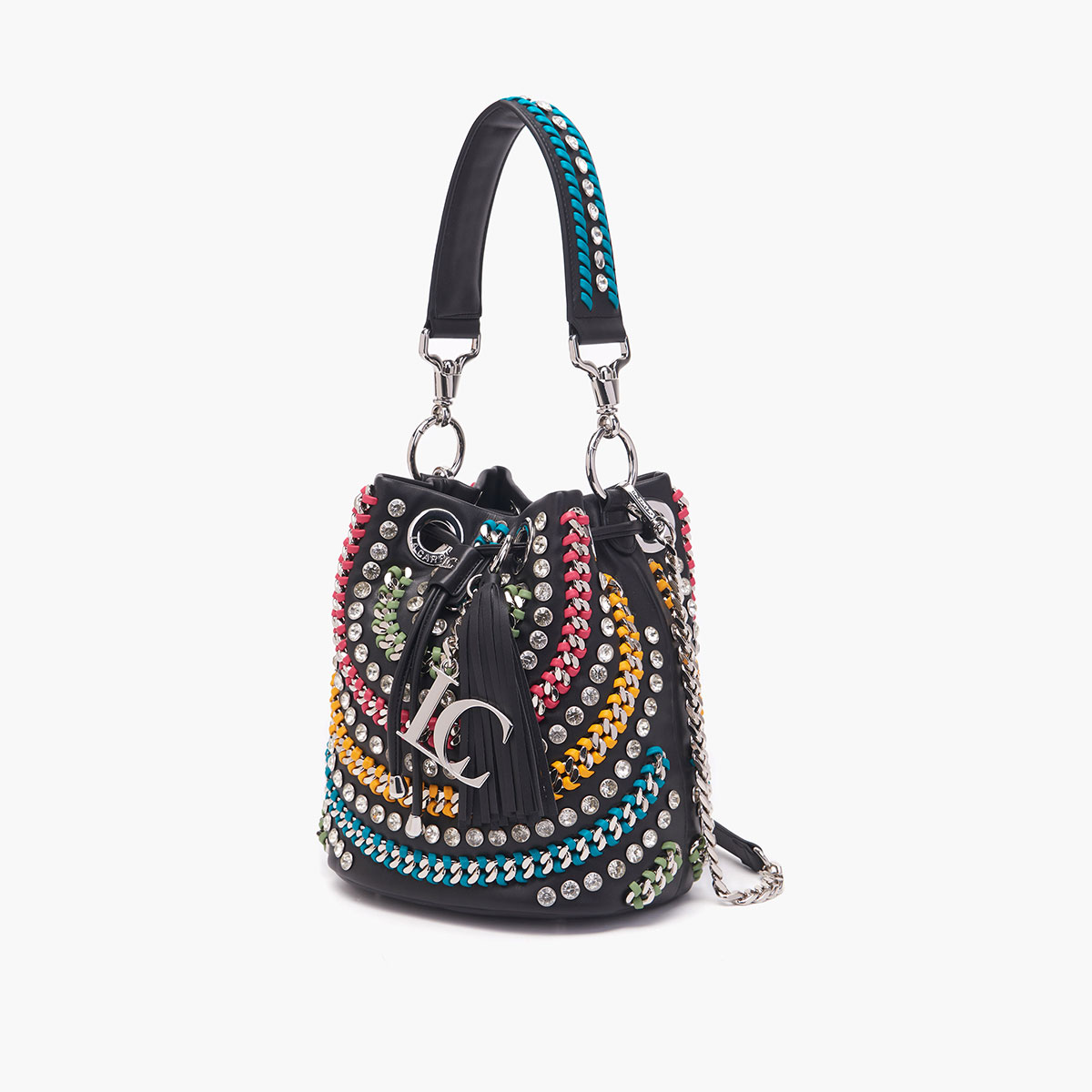secchiello in pu con strass applicati alternati a catene infilate,