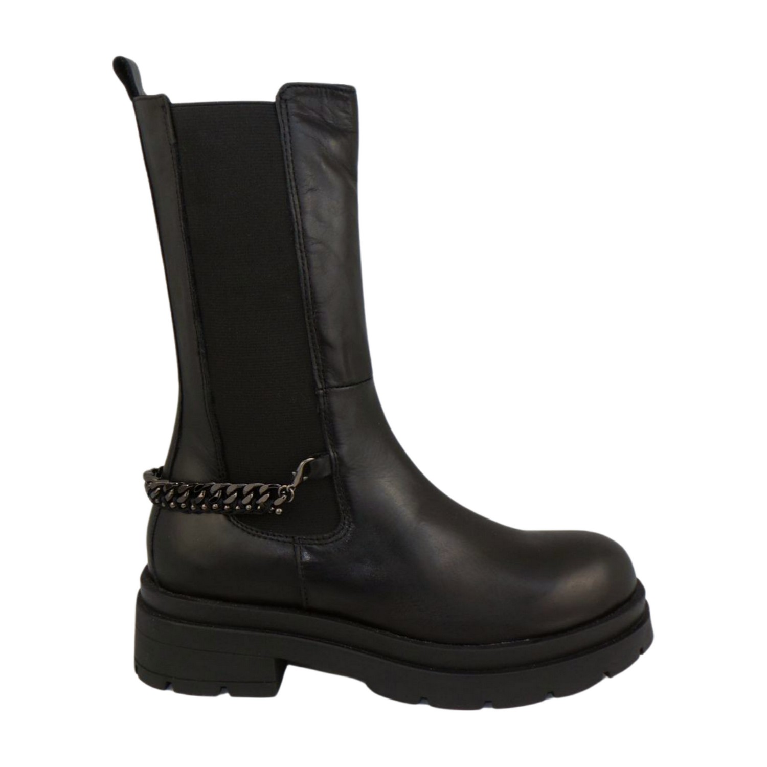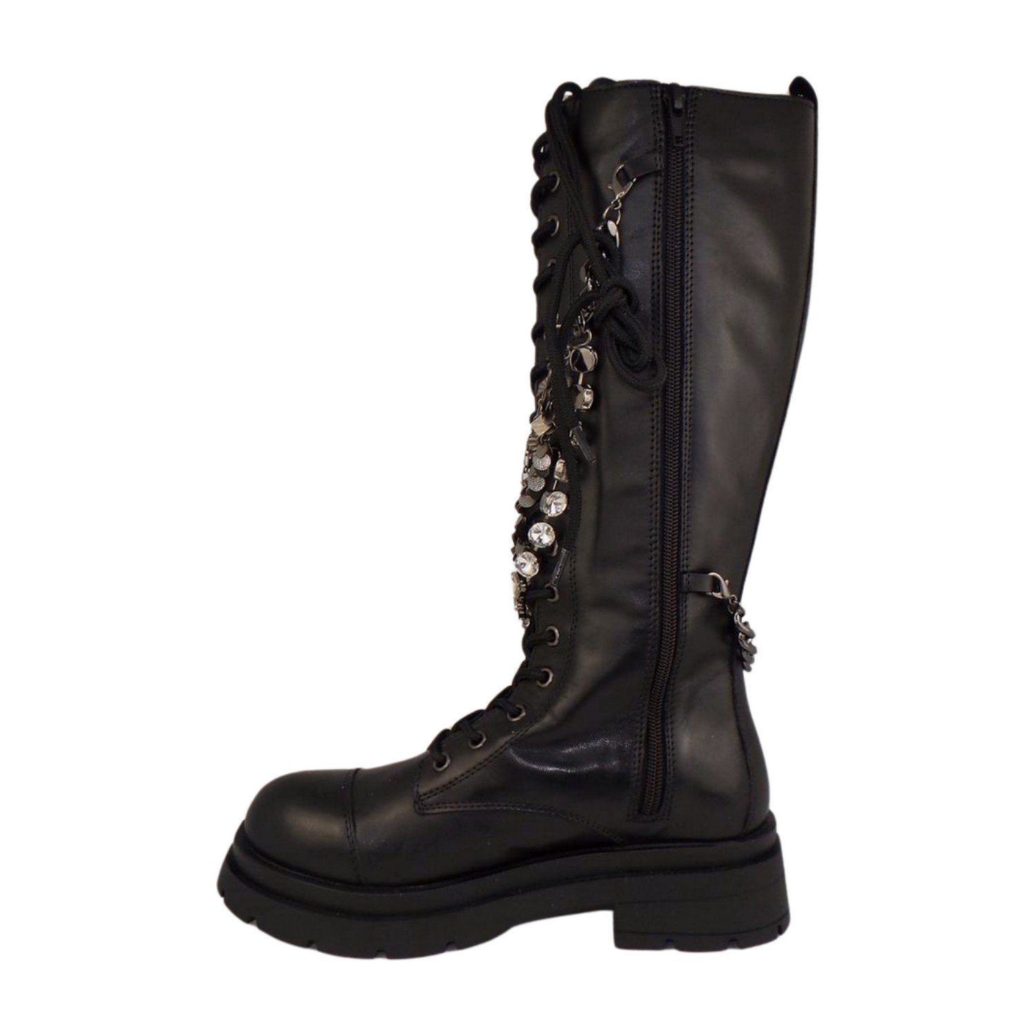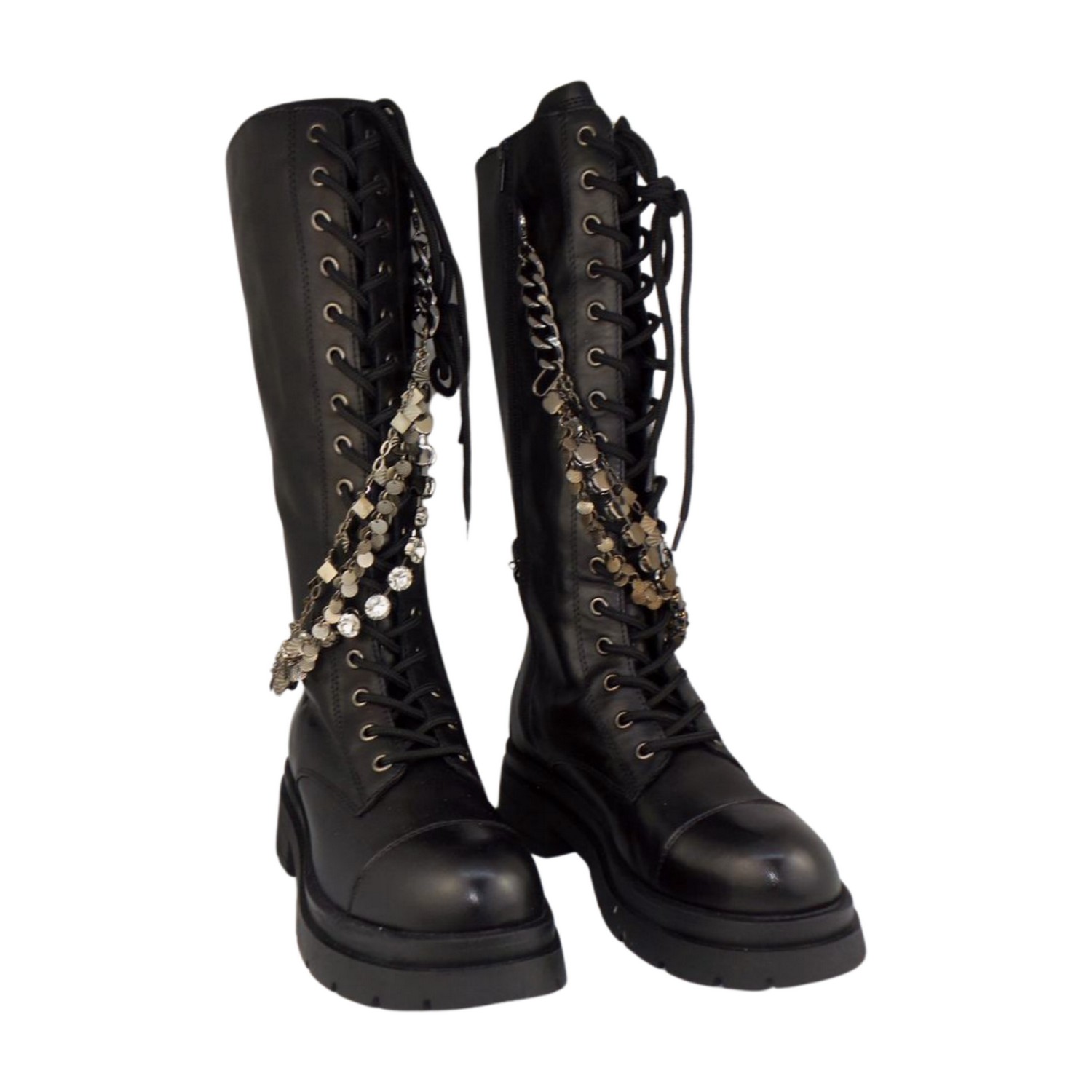 Ti accompagneranno per tutta la stagione invernale questi stivaletti Beatles con  fondo ad effetto carrarmato alto 5,5 cm.Realizzati in morbida pelle di vitello, sono perfetti da indossare da mattino a sera, a lavoro come nel tempo libero. La catena removibile ricoperta di strass, posta sul gambale, non passa di certo inosservata e dona un tocco glam a questi stivaletti di tendenza.