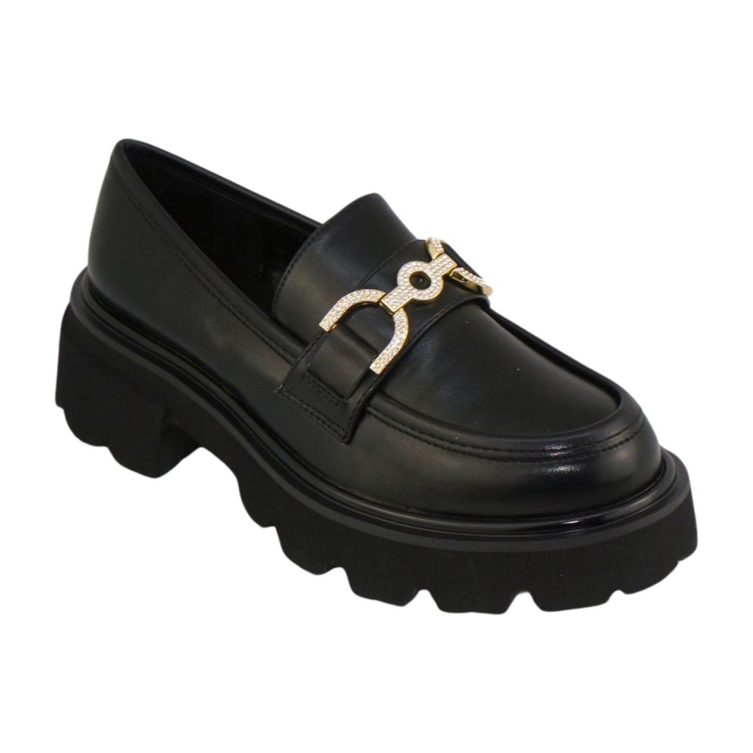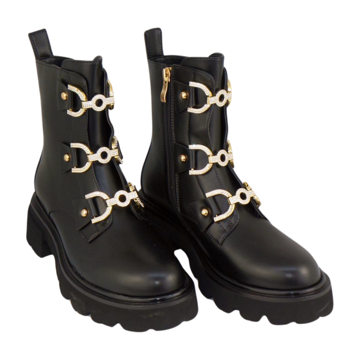I tre grandi morsetti strassati impreziosiscono la tomaia, donandole un tocco di glamour. Il fondo a carro armato con tacco da 6 centimetri è perfetto per slanciare la figura e regalare un’allure sofisticata.