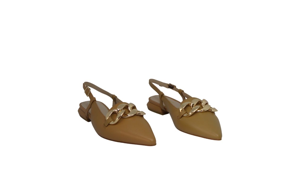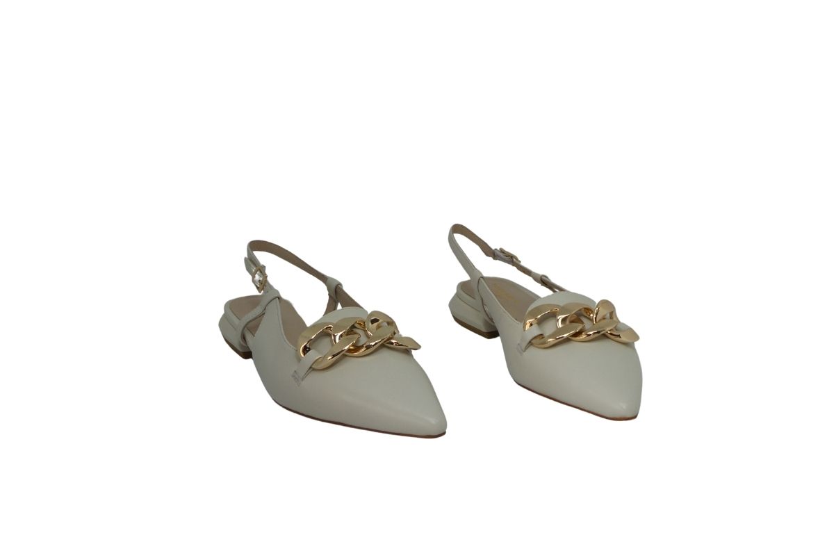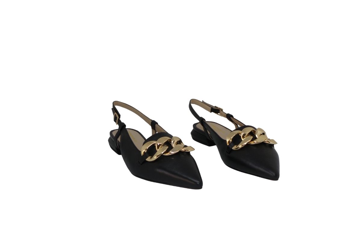 Décolleté aperta tacco basso in pelle con catena.