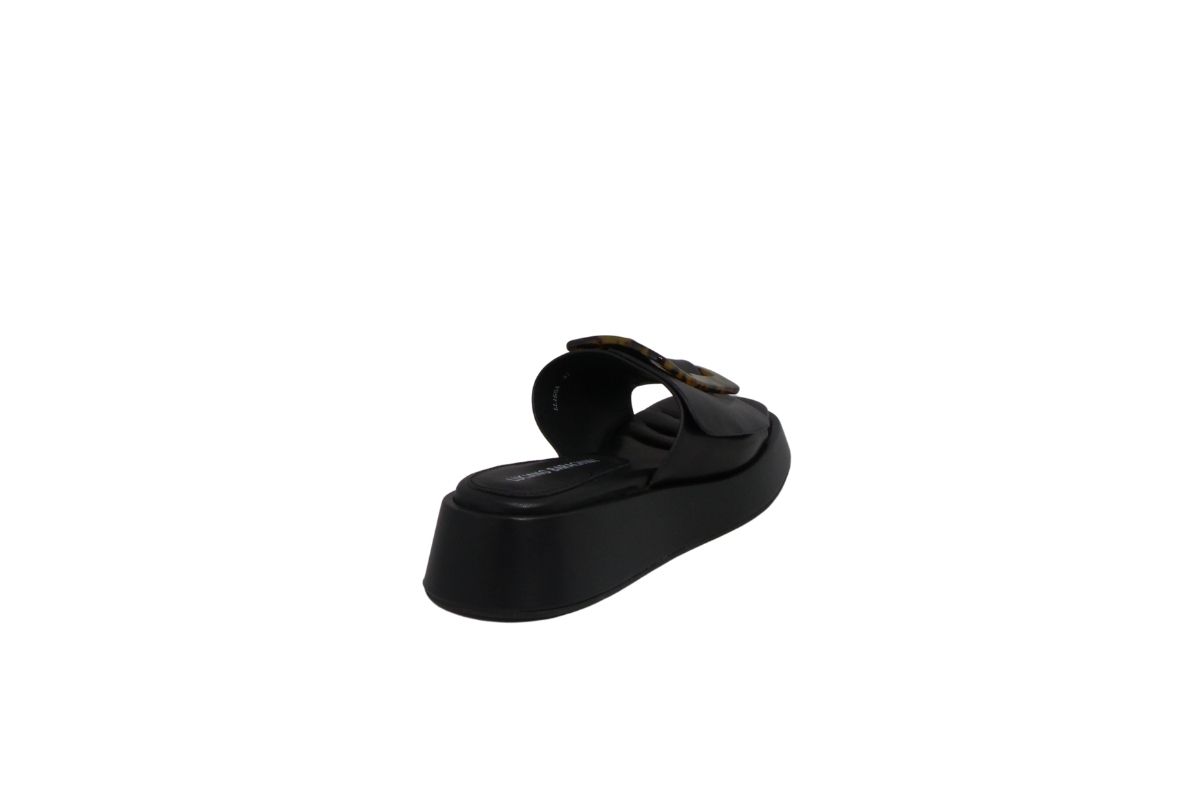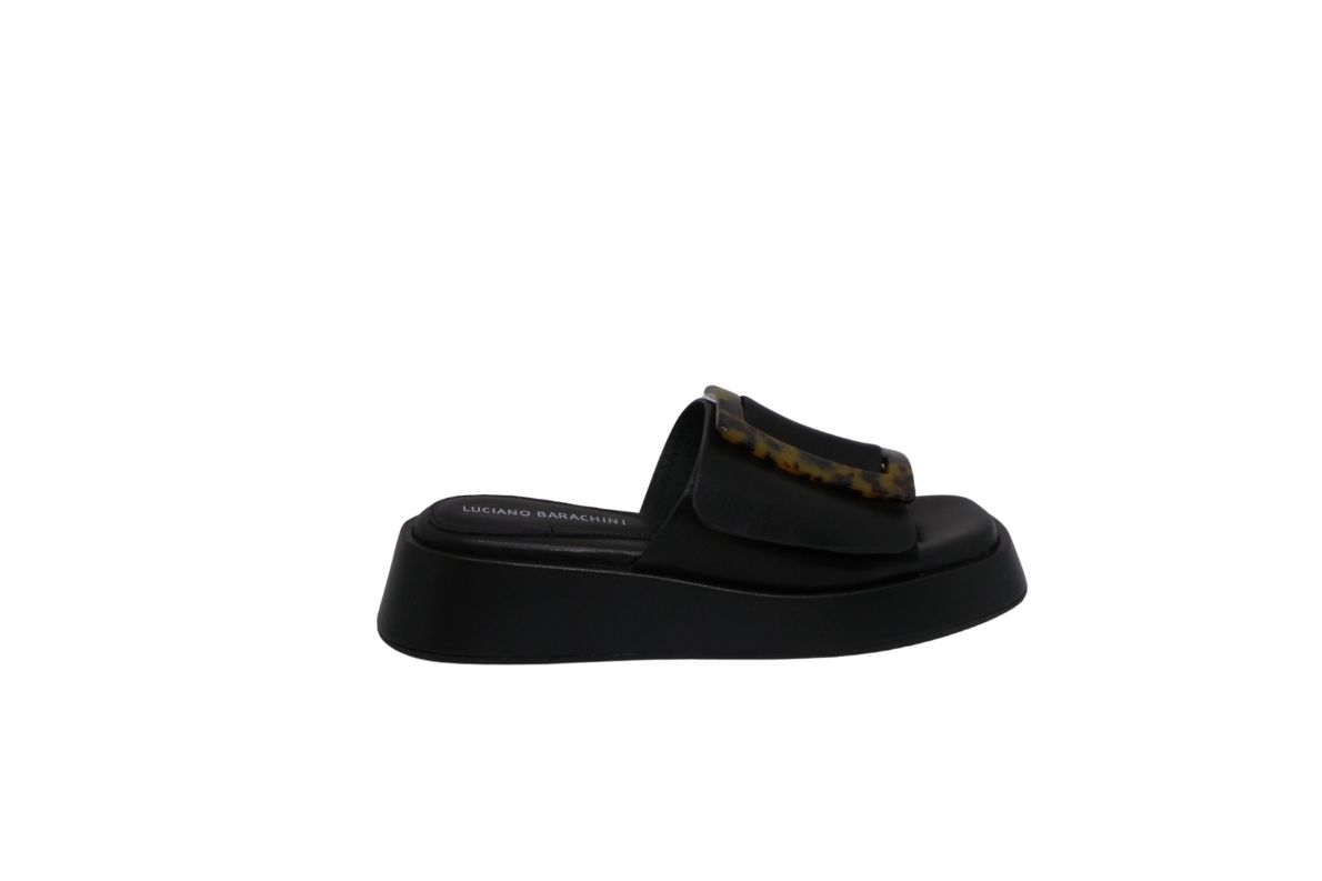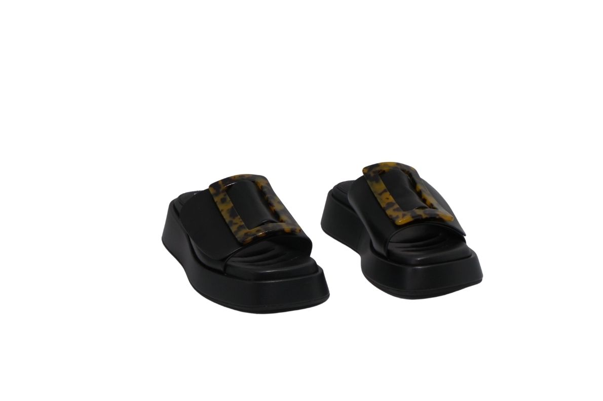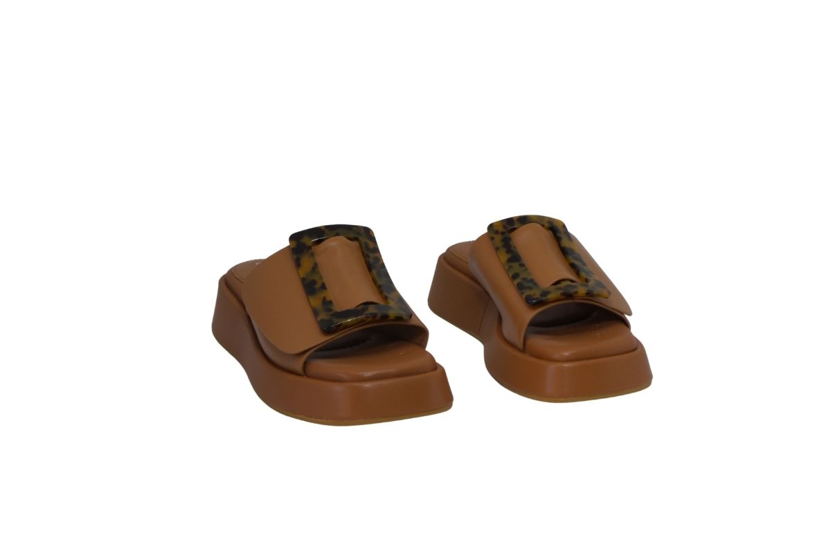 • Maxi fascia in morbidissima pelle sull’avampiede impreziosita da un accessorio in celluloide di forma rettangolare.