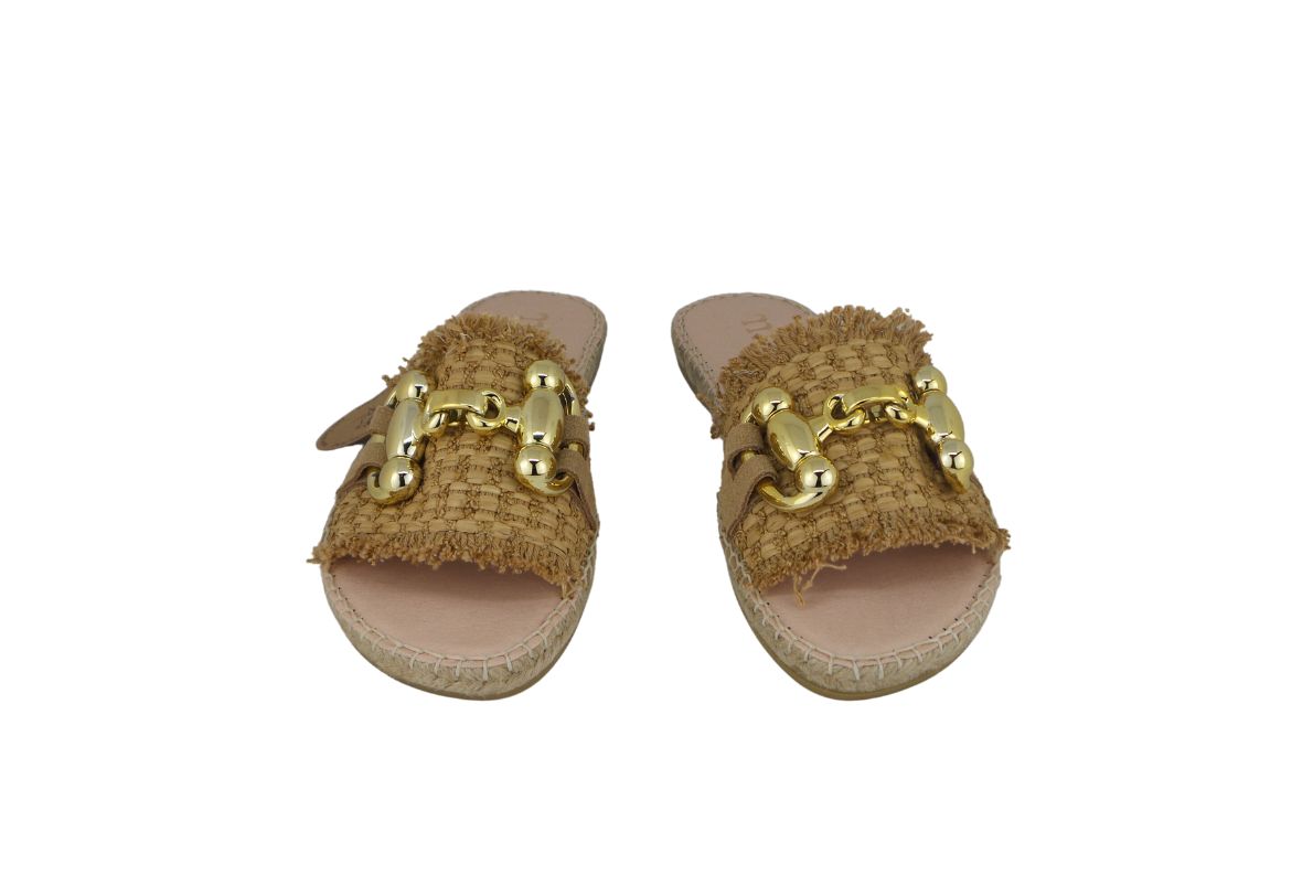 Il dettaglio distintivo di questa ciabatta è la sua fascetta superiore decorata con un elegante motivo, aggiungendo un tocco di grazia e originalità alla calzatura.