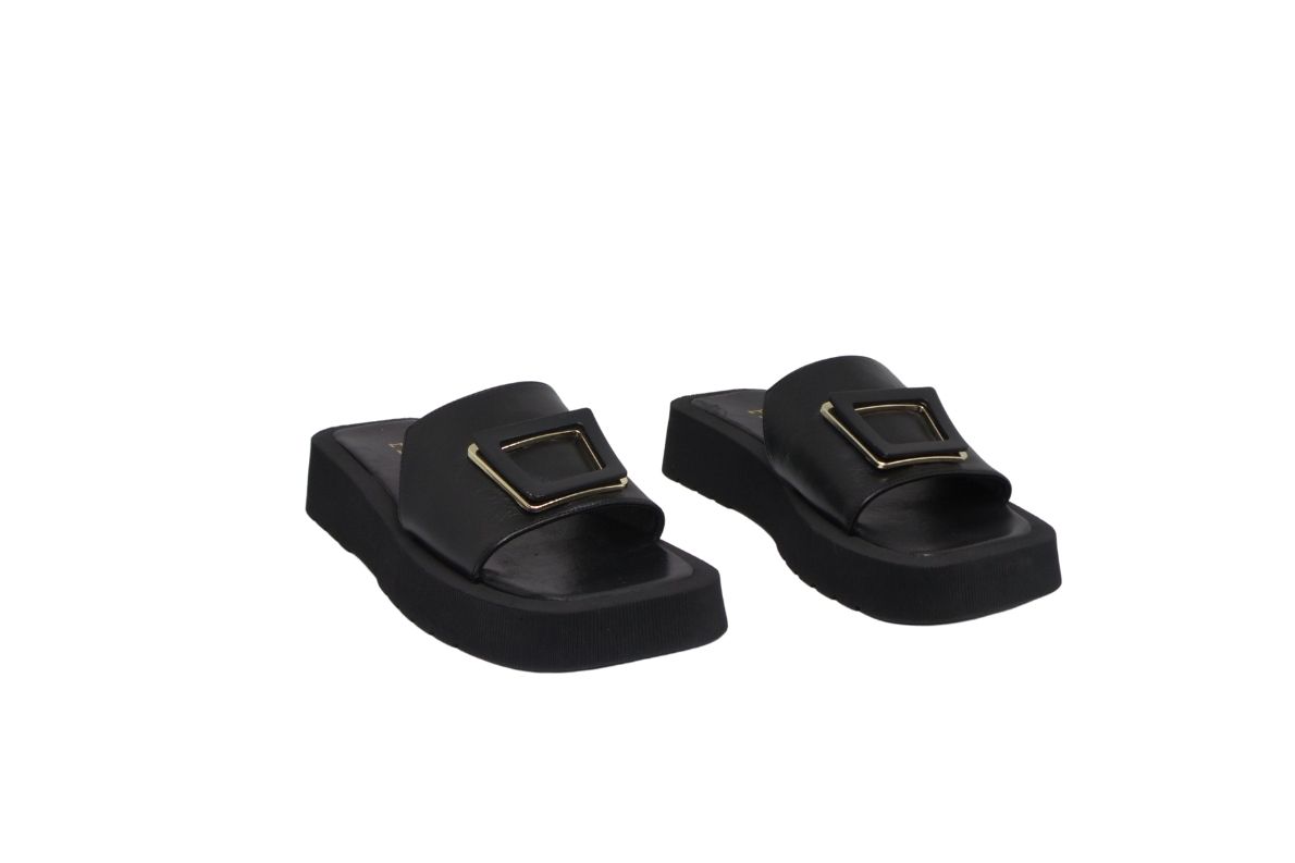 La fascia sull’avampiede è in morbida pelle liscia arricchita da un bellissimo accessorio in metallo e resina , la punta come i tallone sono di forma  squadrata.