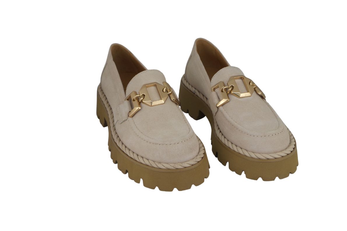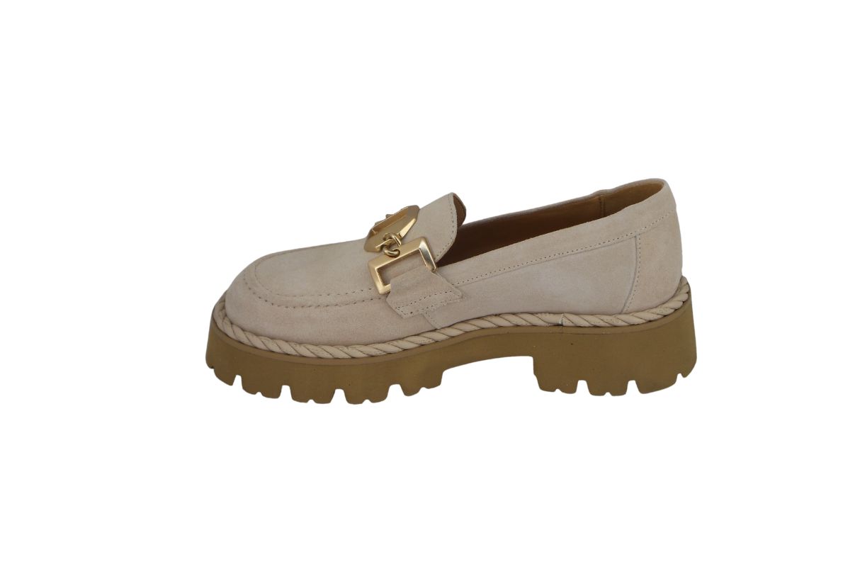 • Mocassino in pelle scamosciata con accessorio metallo sul collo del piede.