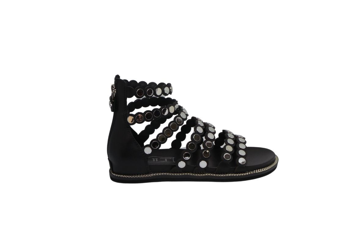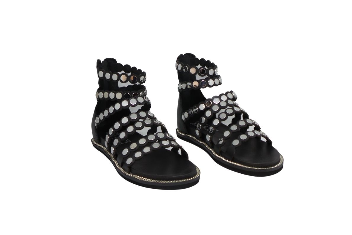 • Il modello è realizzato in pelle con sottili fascette decorate da borchie metalliche, presenta una chiusura posteriore tramite zip.