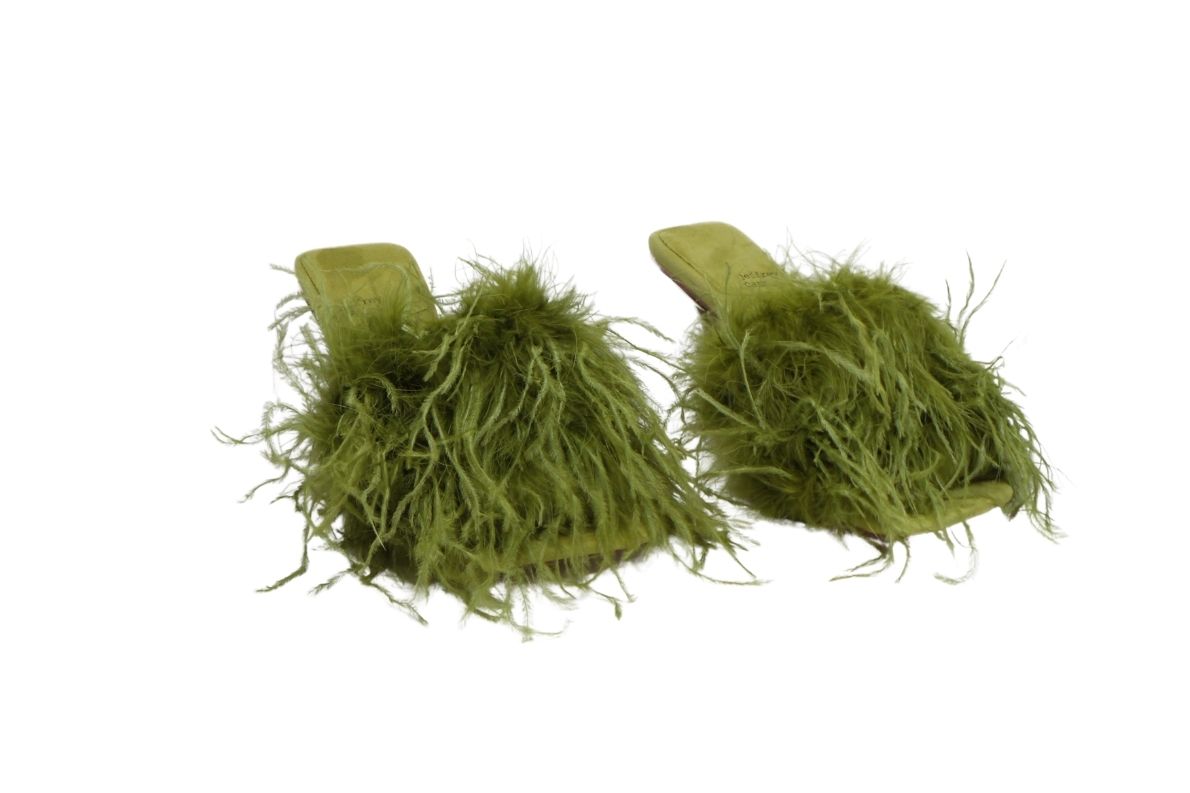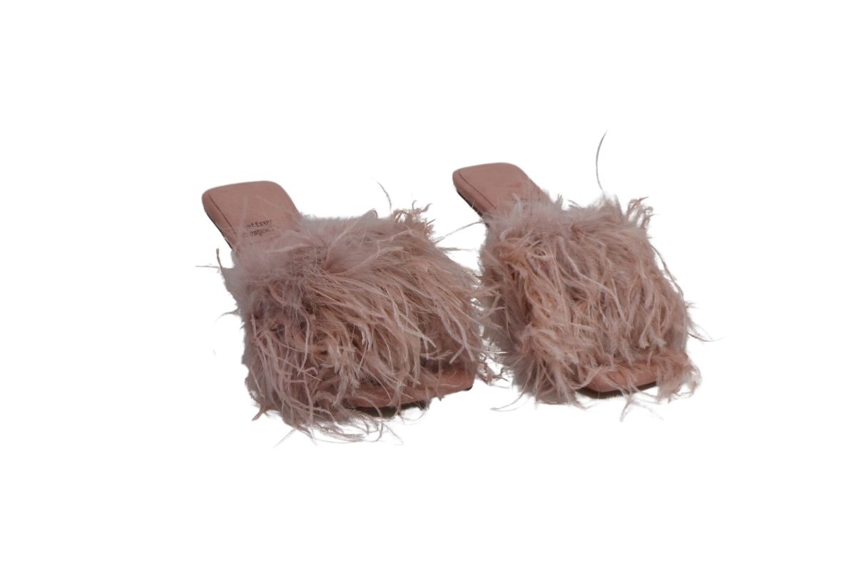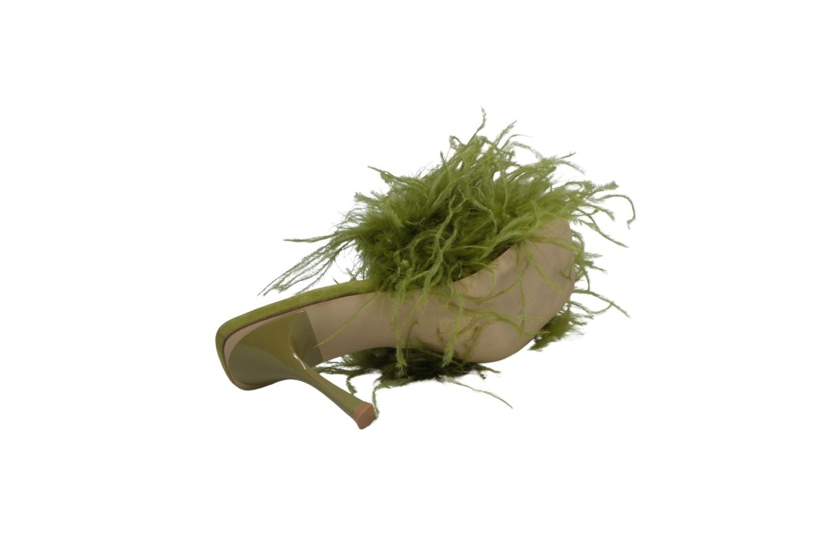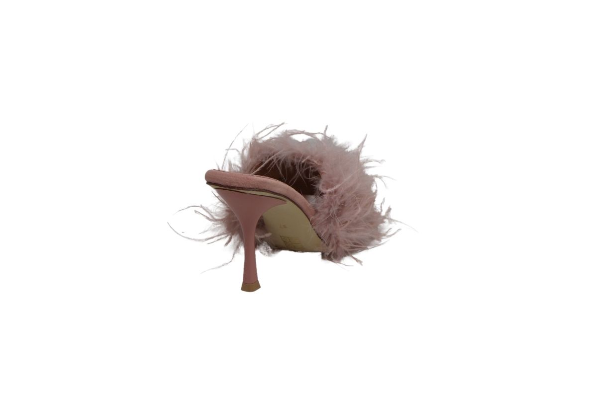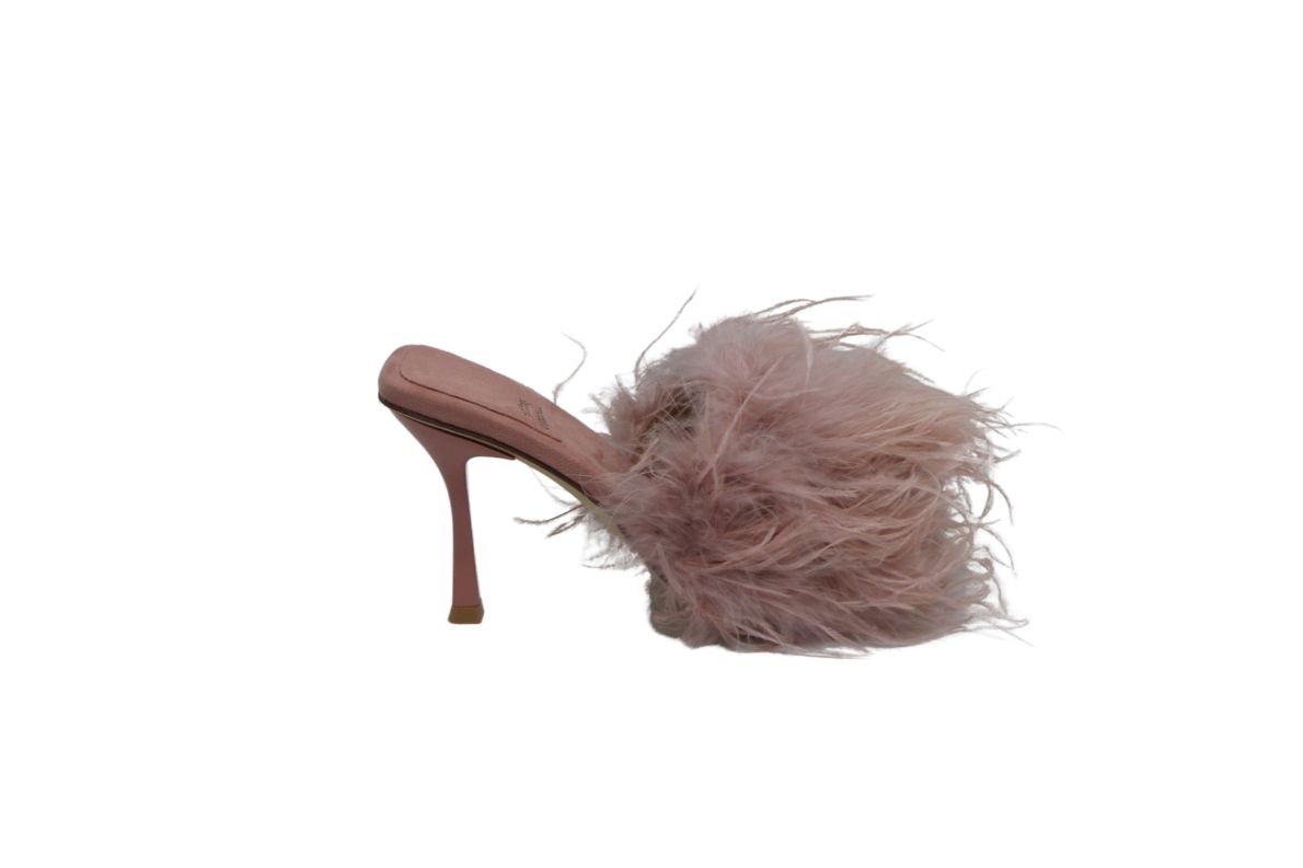• Piume fluttuanti strutturano la tomaia di un sandalo accattivante