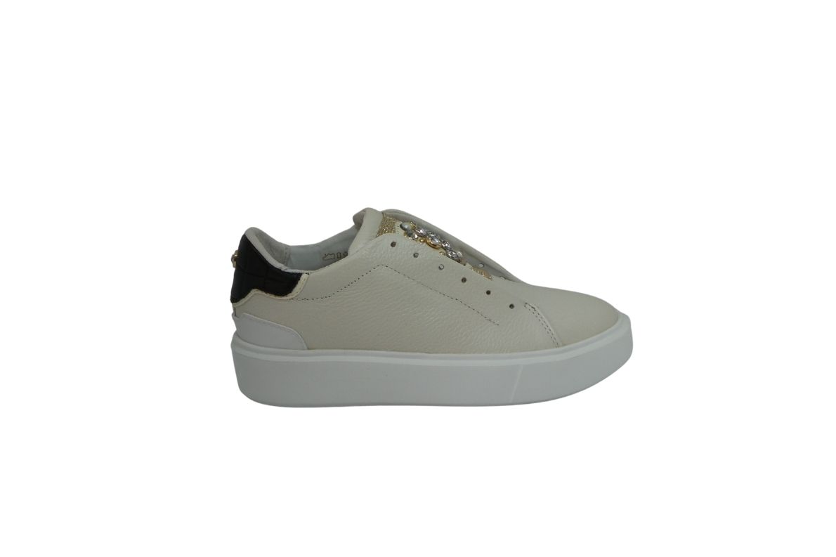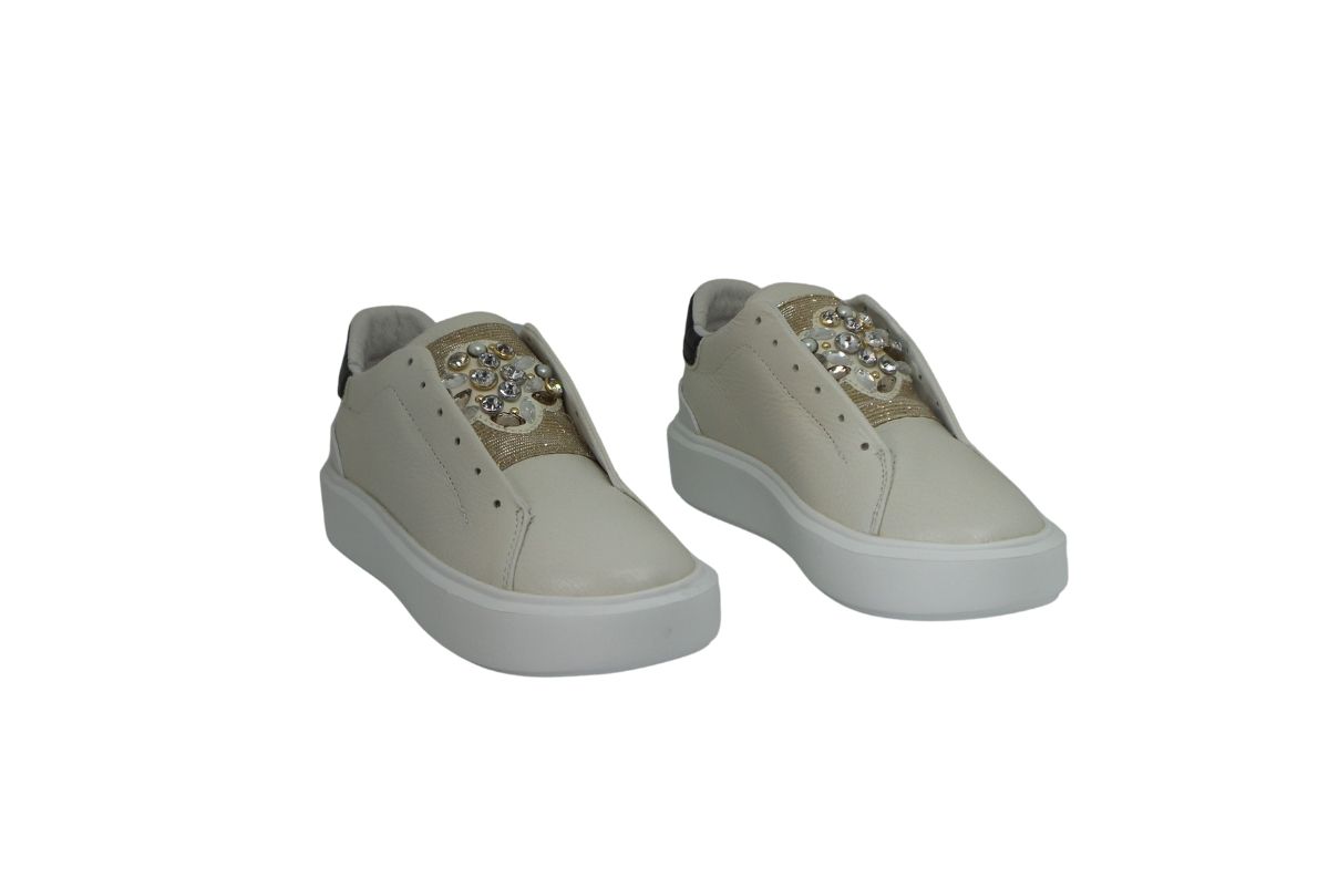 • Tomaia in pelle bottalata crema arricchita da punti luce e borchie sul collo del piede.