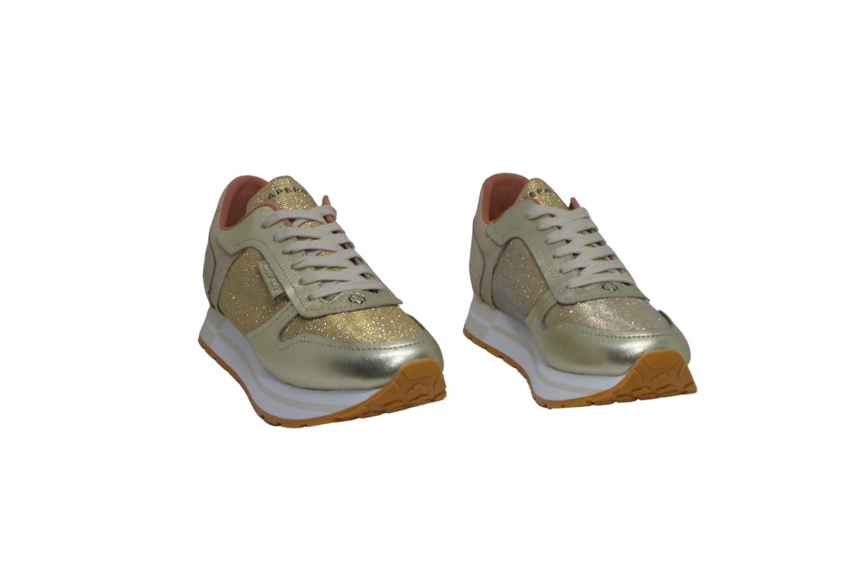 Sneakers  in pelle e glitter disponibile nei colori argento e oro.