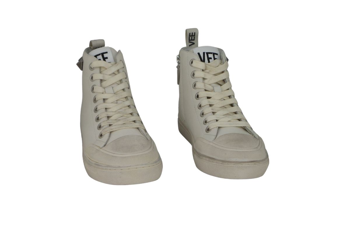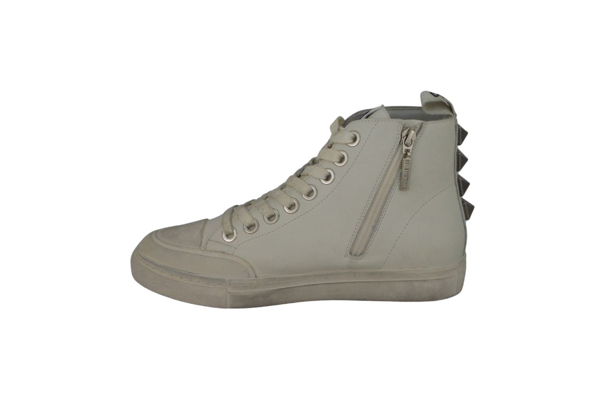 Sneakers in pelle liscia con puntalino in gomma, fondo in gomma effetto vintage, borchie quadrate applicate, chiusura con zip interna. Ottime per tutti i giorni, stile casual alla moda con un piccolo tocco di originalità con decorazioni.