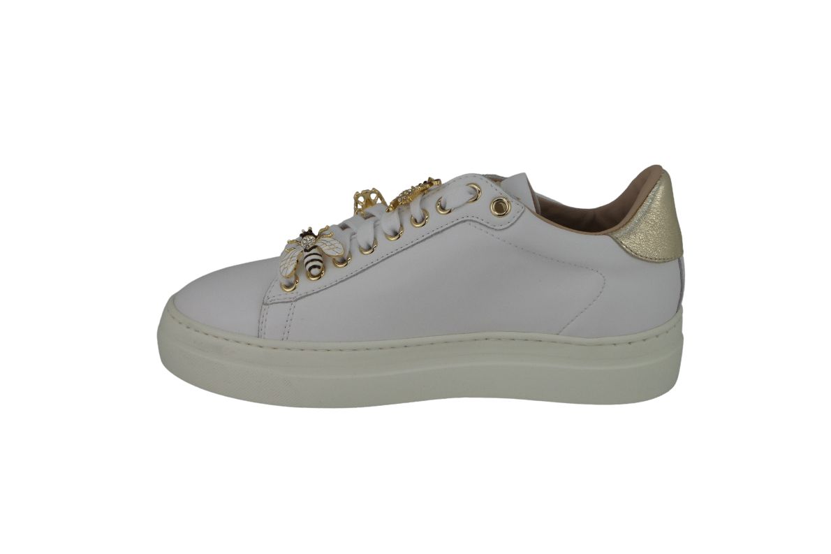 Sneakers scarpe per donna stringate Stokton modello 857-D-FW22 pregiate e fatte in pelle con accessorio catena e perline. Colore bianco con inserti dorati per dare un tocco di unicità a questa scarpa di lusso. il Fondo è in gomma alto 5,5 cm. Comode e casual per tutti i giorni.