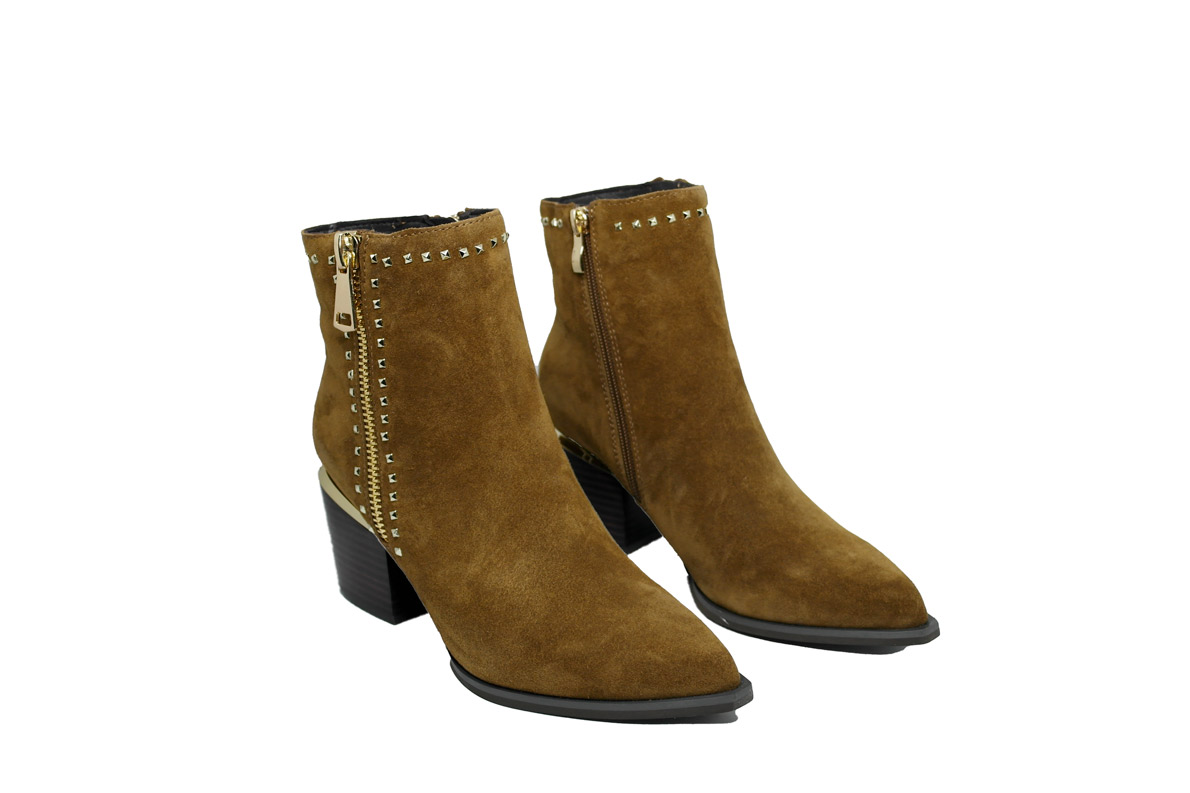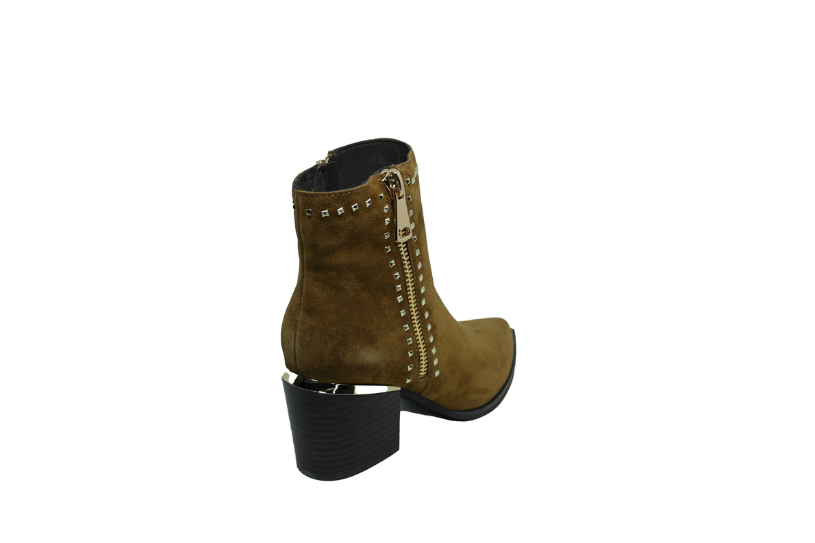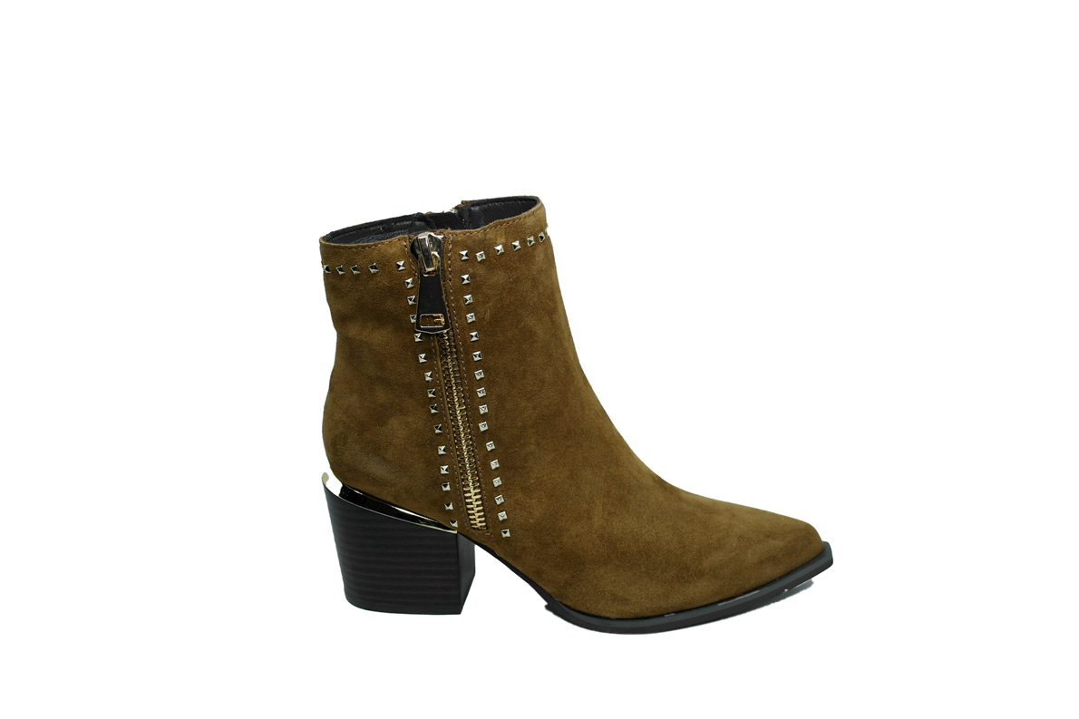 Una tomaia completamente scamosciata è arricchita da delle micro borchie che cingono tutta la caviglia e  accompagnano la cerniera pensata solo per fini estetici.